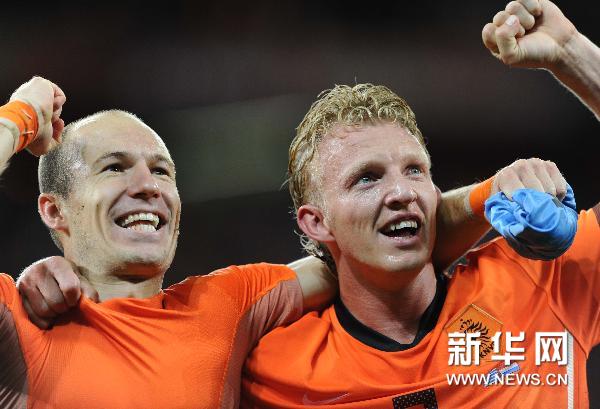 7月6日,荷蘭隊(duì)球員羅本(左)與庫(kù)伊特在比賽后慶祝。當(dāng)日,在開普敦綠點(diǎn)球場(chǎng)舉行的2010南非世界杯足球賽半決賽中,荷蘭隊(duì)以3比2戰(zhàn)勝烏拉圭隊(duì),晉級(jí)決賽。新華社記者陳海通攝
