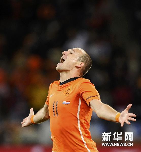 7月6日,荷蘭隊(duì)球員羅本慶祝進(jìn)球。當(dāng)日,在開普敦舉行的2010南非世界杯半決賽中,荷蘭隊(duì)以3比2戰(zhàn)勝烏拉圭隊(duì),挺進(jìn)決賽。 新華社/路透