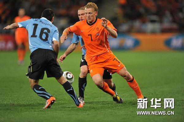 7月6日,荷蘭隊(duì)球員庫(kù)伊特(右)與烏拉圭隊(duì)球員馬·佩雷拉等(左)拼搶。當(dāng)日,2010年南非世界杯半決賽第一場(chǎng)比賽在開普敦綠點(diǎn)球場(chǎng)舉行,荷蘭隊(duì)以3比2戰(zhàn)勝烏拉圭隊(duì),晉級(jí)決賽。新華社記者楊磊攝
