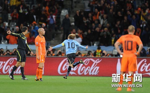 7月6日,烏拉圭隊(duì)球員迭·弗蘭慶祝進(jìn)球。當(dāng)日,在開普敦綠點(diǎn)球場(chǎng)舉行的2010南非世界杯足球賽半決賽中,荷蘭隊(duì)3比2戰(zhàn)勝烏拉圭隊(duì)。新華社記者廖宇杰攝