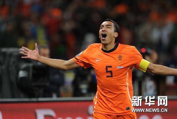 7月6日,荷蘭隊(duì)球員范布隆霍斯特進(jìn)球后慶祝。當(dāng)日,在開普敦綠點(diǎn)球場(chǎng)舉行的2010南非世界杯足球賽半決賽中,荷蘭隊(duì)3比2戰(zhàn)勝烏拉圭隊(duì)。新華社記者陳海通攝