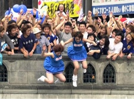 勇敢的日本女球迷 6月25日,在日本隊3比1取勝丹麥,昂首躋身16強后,日本民眾陷入狂歡。而延續了2002年日韓世界杯開始的傳統,大阪道頓堀再次出現聚眾“跳河”慶祝的場面。在超過1000人的圍觀下,總計有超過100名勇敢者跳入水中,借此抒發心中的狂喜。圖為兩位女球迷跳入河中。