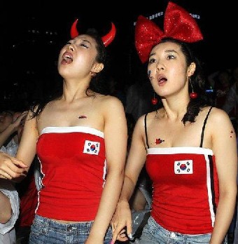 北京時間6月26日22時(南非當地時間16時),世界杯1/8決賽在伊麗莎白港納爾遜-曼德拉灣球場展開首場較量,烏拉圭2比1力克韓國,1970年以 來首次打進8強。上半時,韓國前鋒樸周永任意球中柱,弗蘭助攻蘇亞雷斯首開紀錄,此后蘇亞雷斯單刀被吹越位,但似乎是個誤判。寄誠庸禁區內手球逃過懲罰。下半場,李青龍打 破烏拉圭本屆杯賽不失球金身,此后蘇亞雷斯梅開二度,現以3球并列射手榜首位。在韓國本地也聚集著這么一群別樣風情的“紅魔”啦啦隊,她們用美麗的容顏為自己的球隊吶喊助威。