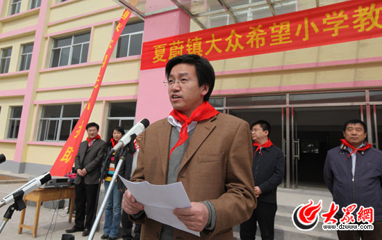 臨沂團市委書記姜寧、大眾網總編輯朱德泉為夏蔚鎮大眾希望小學揭牌。