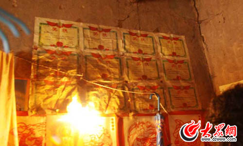 在屋子的一角,一塊布簾圍著一張小床和一個小方桌,這就是王艷的“個人空間”,灰暗的燈光下,記者看到,桌子和床上的被褥都很破舊,但床上方的墻上卻貼滿了獎狀。“這都是王艷在學校得的”,王艷的爺爺說,孩子的成績好是他最大的欣慰,“就是砸鍋賣鐵,就是貸款,我也要供孩子上大學。”