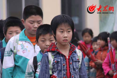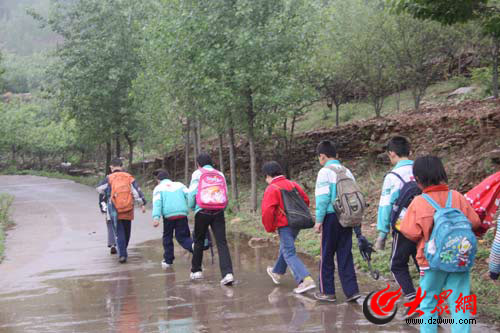5月17日下午5點(diǎn)左右,臨沂市沂水縣西部的群山里云環(huán)霧繞、細(xì)雨蒙蒙。在夏蔚鎮(zhèn)透明崮村旁的環(huán)山公路上,一群高矮不一的孩子正冒雨排隊(duì)往前走。他們都是夏蔚鎮(zhèn)透明崮教學(xué)點(diǎn)剛剛放學(xué)的學(xué)生,他們的家就散落在周圍大山深處的十幾個(gè)自然村里,最遠(yuǎn)的學(xué)生要翻越一座大山,走將近兩個(gè)小時(shí)才能到家。