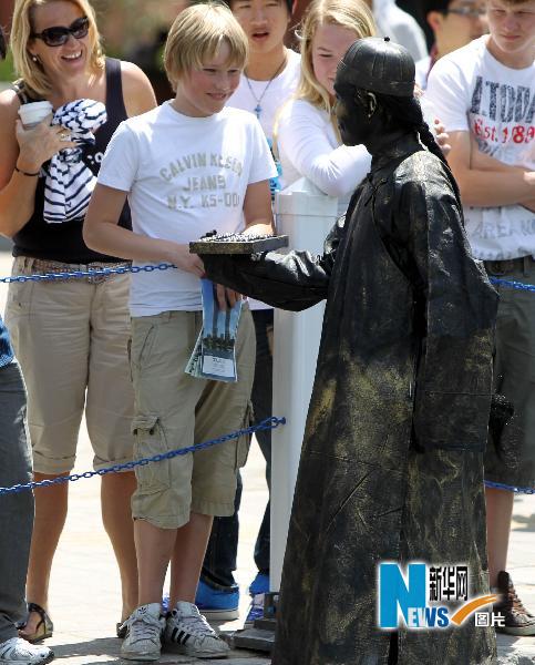 5月7日,幾位外國游客對世博園內的真人“雕塑”很感興趣。上海世博會開幕以來,眾多外國游客興致勃勃地參觀世博園。新華社記者張明攝