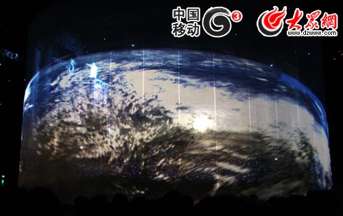 19:40,演出正式開始了。燈光熄滅,隨著一聲隆隆的巨響,巨大紗幕的上出現了遠古時代的畫面,臺上的表演者跟隨著不同的布景變換著服裝,演繹出人類發展的一幕幕標志性進程。伴隨驚雷般的崩坍聲,場景又變換了起來,繁星點點的夜空中飄起天使的歌聲,飾演天使的演員吊著威亞懸在空中變換著各種姿勢,穿梭在舞臺的不同位置。隨著小天使降落人間,紗幕上的圖案也從天堂逐漸變為太空、地球、上海……演出逐漸進入主題。