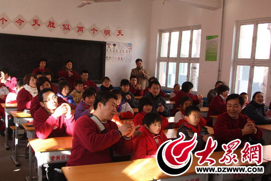 志愿者徐磊(左一)、韓紅偉(右一)和濟南劉家慈安小學的小朋友們演示洗手要領