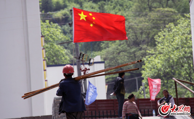 一名建筑工人在黑水縣雁江寄宿制初級中學改擴建工地的國旗下肩扛建筑材料走過。(曹亮 攝)