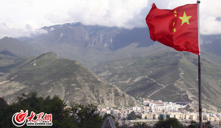 在茂縣鳳儀鎮坪頭村,海拔1688米的水風羌寨樓閣掩映,國旗隨風招展。站在樓宇陽臺上眺望,一座嶄新的茂縣縣城在紅旗的襯托下反射著燦爛的陽光。住進新樓房的羌族大娘羅英杰已經65歲了,她身著艷麗的羌繡服飾高興地唱起了民歌。
