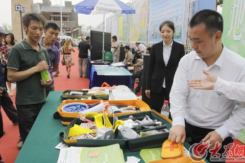 地震自救包在新北川縣城巴拿恰展示,引來游人駐足