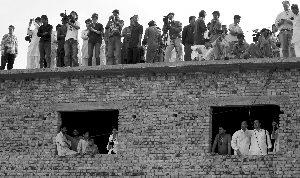 4日,巴基斯坦阿伯塔巴德,拉登被擊斃后,拉登藏身房屋附近的屋頂上聚集了大量當?shù)鼐用窈陀浾摺?/p>