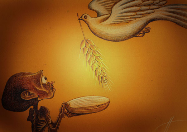 《和平》常人眼中的和平是:和平鴿叼著橄欖枝--沒有戰爭就是和平;而在饑餓的非洲難民眼中--和平鴿叼著金色麥穗才是和平,民以食為天……吃飽肚子就是和平!
