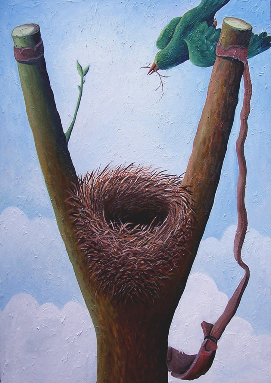 鳥在萌芽的彈弓叉上筑巢——人們不再用彈弓打鳥,將木制彈弓叉栽植在地上生根發芽,呼喚環保愛護鳥類。