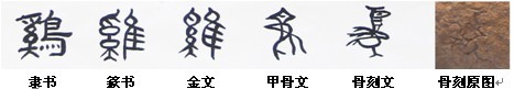 筆者認為,根據甲骨文向金文演變的某些規律,對于東夷骨刻文的破譯是非常有必要借鑒的。甲骨文向金文的過渡有幾種情況,一是從具有很強的圖畫性到脫離圖畫的符號化的演變;一是由繁到簡的演變;再就是完全照搬,筆畫相同,有的只是在書寫方法上略有變化。當然也有少量是由簡到繁的,這往往是形聲字演變的結果,有的增加了形旁或聲旁,但基本上是萬變不離其宗,有規律可循的。而東夷骨刻文向甲骨文的演變也基本上存在這四種情況,只不過由圖畫性向符號化過渡更為明顯,由象形、指事、會意向形聲字轉變的還不多見。由于借鑒了這一規律,在劉教授破譯的八個字的基礎上,筆者一口氣又破譯了近百字。為了便于對照辨認,按照漢字發展和演變的順序,對這些破譯出的文字分別用骨刻文、甲骨文、金文、小篆和隸書的書體,以書法藝術的表現形式創作了幾幅題為“中國文字演變過程”的書法藝術作品,并在每字后附有骨刻原圖,今取其一,以供讀者參考鑒別。(如圖)