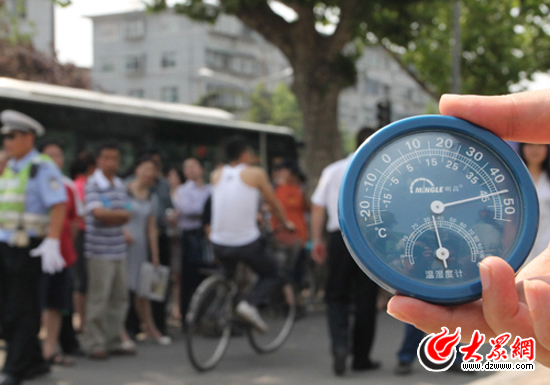6月8日14:41 濟(jì)南商貿(mào)學(xué)校 見(jiàn)習(xí)記者 馬鑫:烈日下的溫度已達(dá)45攝氏度