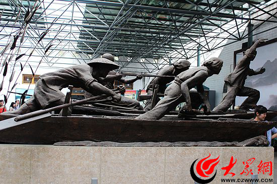 (紀(jì)念館內(nèi)的雕塑) 白洋淀人民有著光榮的革命傳統(tǒng)。在抗日戰(zhàn)爭(zhēng)時(shí)期,白洋淀地區(qū)人民成立了著名的水上游擊隊(duì)“雁翎隊(duì)”,利用河湖港叉開展游擊戰(zhàn)爭(zhēng),威震敵膽。