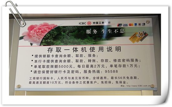 24小時自助銀行,使用起來也相當方便,傻瓜式操作外加清楚明了的說明醒目的貼在每臺機器上方: