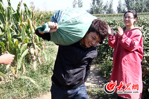 在大片大片的玉米地里幾個轉(zhuǎn)彎后,拖拉機(jī)停下來。簡單分工后,尹老師下達(dá)了任務(wù),“每人至少掰一口袋棒子!”憑著小時候積攢下的“老練”技術(shù),除了老鄉(xiāng)夫婦,我成為了四位記者中速度最快的一位。