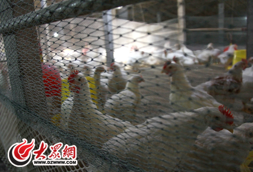 在李富來的帶領下記者鉆進了他家的雞棚,棚里的燈光很暗,雞欄里的雞如今都已經長成,雖然棚里的通風措施做得不錯,但是濃烈的雞糞味還是熏得人直頭疼,可能是因為到了喂食的時間,看到有人進來棚里的雞就一起咕咕的叫了起來。
