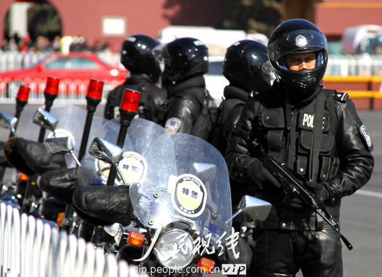 人民網北京3月3日電 為確保全國兩會召開,2011年3月2日北京天安門廣場,加強了安全警力,武警戰士和公安民警在天安門廣場進行執勤、巡邏、巡查工作,為兩會保駕護航。(徐經來)
