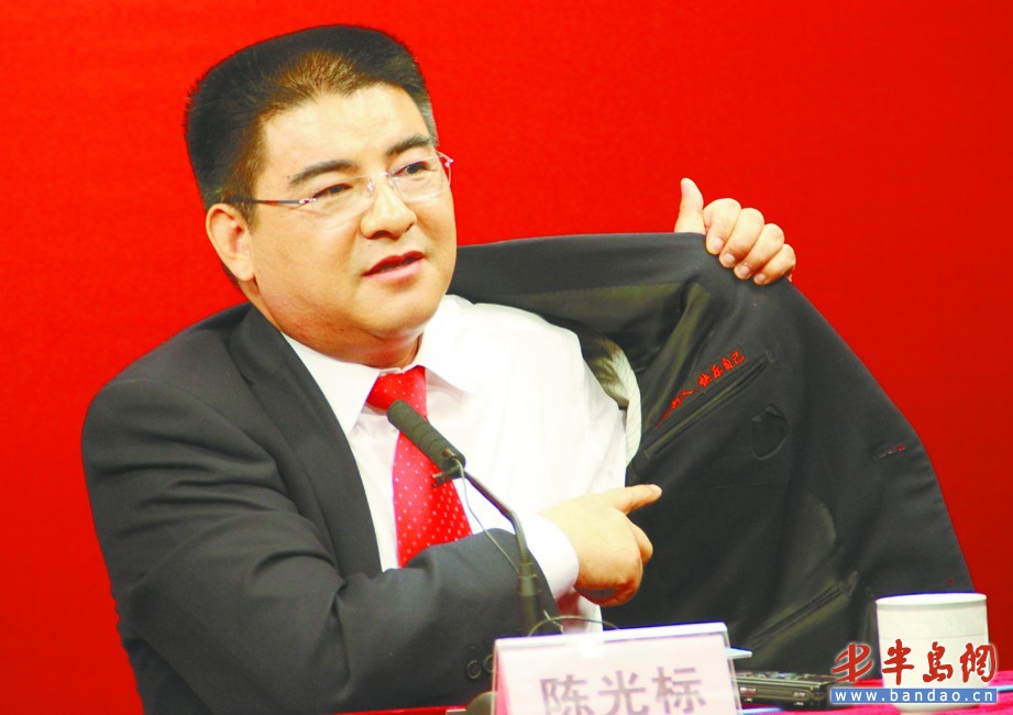 在懇談會現場,陳光標的穿著也吸引了記者們關注的目光。當有記者問他身上的西裝多少錢時,陳光標主動展示了自己這套西裝,“1200塊錢,鄂爾多斯的。這邊印著是鄂爾多斯 ,這邊印著是‘幫助別人,快樂自己’。”