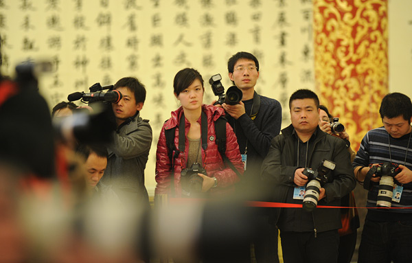 十一屆全國人大四次會議于3月4日(星期五)上午11時在人民大會堂三層金色大廳舉行新聞發(fā)布會,由大會發(fā)言人就會議議程和人大工作相關的問題回答中外記者的提問。圖為新聞發(fā)布會現(xiàn)場記者。翟子赫 攝