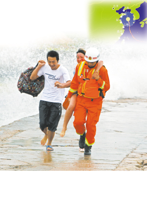 8月7日,游客在青島市嶗山區小麥島上游玩時,突遇臺風“梅花”所致的海上大浪,小島與陸地唯一相連的堤壩被阻斷,83人被困島上。青島市公安局接到報警,邊防、公安、消防等部門人員緊急趕赴現場展開救助。救援人員利用浪頭短暫間歇,分6批次將被困人員護送至陸地,使他們全部脫險。圖為一名被困的姑娘鞋子丟了,救援隊員背著她走過堤壩。
