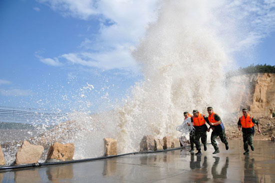 浙江省溫嶺市石塘鎮居民在海邊觀巨浪