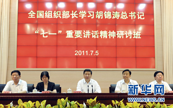 全國組織部長學習胡錦濤總書記“七一”重要講話精神研討班5日在全國組織干部學院開班。中共中央政治局常委、中央書記處書記、國家副主席習近平出席開班式并講話。他強調,胡錦濤同志“七一”講話是總結過去、開創未來的馬克思主義綱領性文獻,對黨的建設和組織工作具有十分重要的指導作用。組織工作戰線的同志要帶頭深入學習,在工作中切實貫徹,各級領導干部要努力學得更深一些、更好一些,以自己的模范行動促進和帶動組織工作戰線學習貫徹的深入。