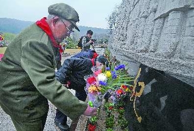 老戰(zhàn)斗英雄們?yōu)橄攘揖传I(xiàn)鮮花。