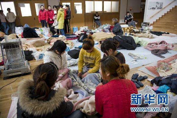 3月14日,在日本巖手縣大船渡市,一些中國籍在日研修生在避難所內休息。 新華社記者 呂小煒 攝