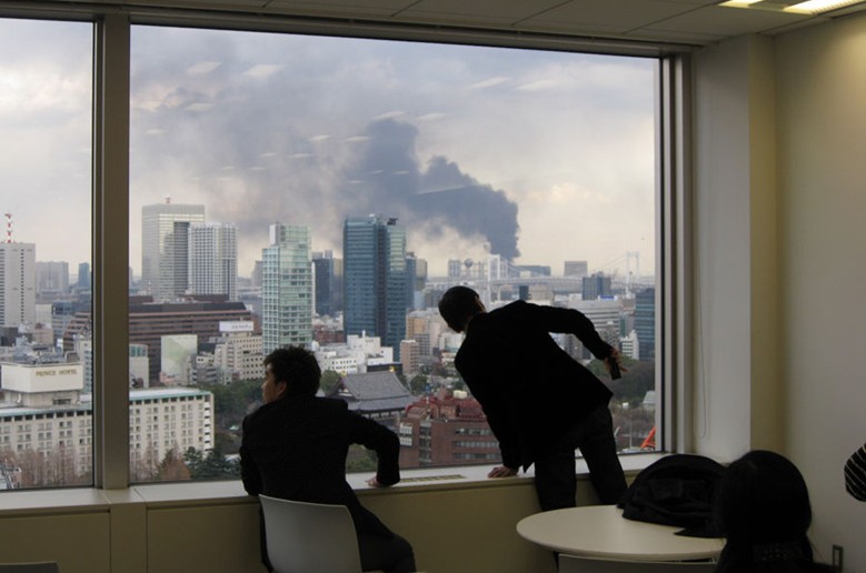 大樓管理處的廣播很快響起,告知發生地震,請樓內人員做好自我保護措施。不久,搖晃稍停,一些膽大的人走出房間,聚集在樓層大廳中,互相打聽情況。有些人打開手機中的NHK直播節目,這時電視已在滾動播放地震和海嘯的畫面。