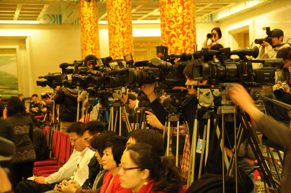 2011年3月4日11時,十一屆全國人大四次會議新聞發(fā)布會在人民大會堂三層金色大廳舉行,大會發(fā)言人介紹會議情況,并回答記者的提問。圖為新聞發(fā)布會前記者們在調(diào)試設(shè)備。宋君毅 攝