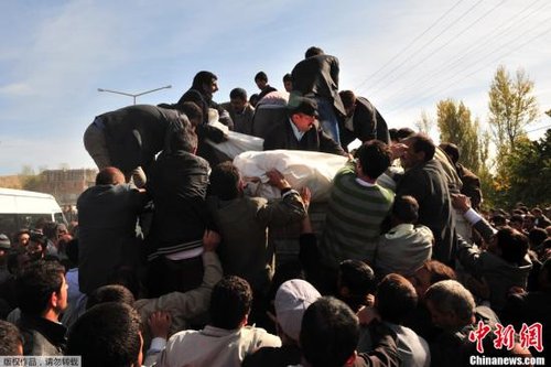 當地時間10月24日,土耳其東部地震災區凡省,災民搶奪一輛土耳其紅新月會卡車上的救援物資——帳篷。23日發生在土耳其東南部的7.2級地震,已經造成2262座建筑物遭到損壞,279人死亡,1300人受傷。