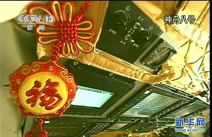 11月1日,神舟八號飛船在酒泉衛(wèi)星發(fā)射中心升空。這是飛船內(nèi)的中國結(jié)。新華社發(fā)(視頻截圖)