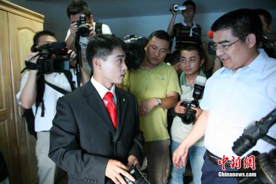 資料圖: 7月28日,被社會關注的“地鐵賣藝”前體操冠軍張尚武抵達南京,接受中國首善、江蘇黃埔公司董事長陳光標給他的一份工作。陳光標表示要和張尚武一起穿著運動裝健身。申冉攝
