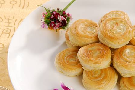 一、 千層油酥餅(榮獲“金鼎獎”、“中華名小吃”稱號) 【典故】 千層油酥餅被譽為“長安第一點”。相傳,唐玄奘法師取經回長安后,翻譯佛經達千卷時,唐高宗李治命宮中御廚專門用植物油炸成“千層烙餅”,賞賜給玄奘,以示慰勞和表彰。后經歷代廚師不斷改進,取名為千層油酥餅。千余年來歷久不衰,一直流傳至今。