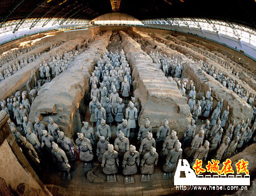 秦始皇陵位于距西安市30多千米的臨潼縣城以東的驪山腳下。是中國最大的古代軍事博物館,俑陣經上世紀70年代發掘對外開放后便轟動世界。據史書記載:秦始皇嬴政從13歲即位時就開始營建陵園,由丞相李斯主持規劃設計,大將章邯監工,修筑時間長達38年。秦俑坑坐西向東,1、2、3號兵馬俑坑呈品字形排列,總面積2萬余平方米,共有陶俑、陶馬約8000件,像個龐大的地下軍團。3個俑坑內現已發掘出土陶俑、陶馬2000余件,戰車30余乘,各類青銅兵器40000余件,還有大量的其他遺跡、遺物。陶俑、陶馬的大小和真人、真馬相似,種類眾多,有車兵、步兵、騎兵等不同的兵種,排列有序,氣勢磅礴,是秦王朝強大軍隊的縮影,且陶俑面容神態各異,體現出靜中寓動的藝術效果。