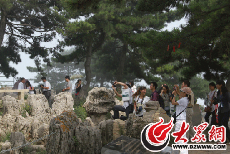 在導游的引導下,采訪團一行來到了景區(qū)的一處觀景臺上,放眼望去,只見四周都是千姿百態(tài)的奇峰石林,它們座座拔地而起,尤如一根根頂天立地的石柱,遠遠看去又象一道道海浪,在霧靄云海中爭奇競險。更妙的是,在這些石峰之巔,均有參天的青松翠柏復蓋,在絕壁石隙間,亦有彎曲多姿的古樹凌空延展。加之有奇花異草,百鳥爭鳴,令人目不暇接。 那些臨風飄渺的云海在風的推動下飄到人的臉上,給人以涼爽的感覺?吹竭@動人的美景,記者們紛紛拿起手中的相機,或定格美麗的風景,或記錄下這一刻的感動。