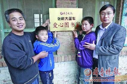 [提要] 本報記者張剛(左一)、山東世紀(jì)金榜書業(yè)有限公司陳衍強經(jīng)理(右一),和孩子們一起為“張剛大篷車”愛心圖書室揭牌。自從本報9月24日刊出趙建莊中心小學(xué)《300小學(xué)生渴盼課外書》的報道以來,社會各界捐贈的愛心書籍不斷涌到本報編輯部。