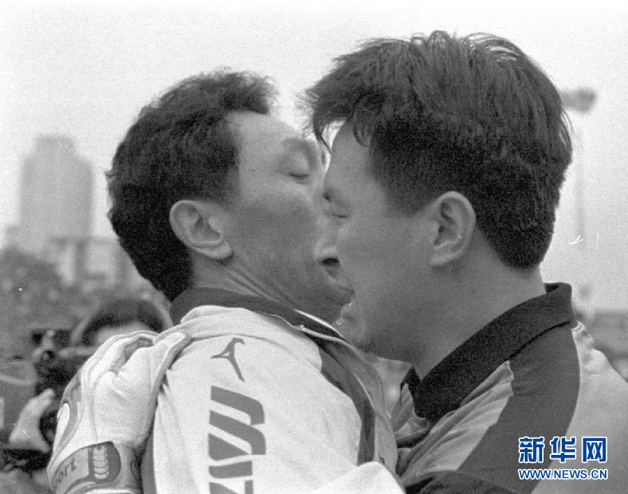 圖為1999年12月5日沈陽隊(duì)守門員王灝(右)在比賽結(jié)束后與一名教練員熱烈擁抱,慶祝保級(jí)成功的資料照片! ⌒氯A社記者楊磊攝(傳真照片)