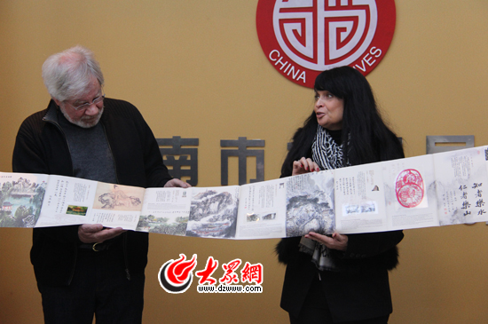 西維亞夫婦收到濟南檔案局贈送的禮物——一幅泉城畫卷。