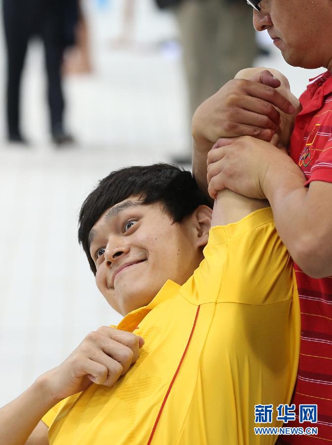 7月31日,孫楊(下)在工作人員的協(xié)助下熱身。當(dāng)日,倫敦奧運(yùn)會(huì)游泳比賽在奧林匹克公園水上中心繼續(xù)進(jìn)行。 新華社記者凡軍攝