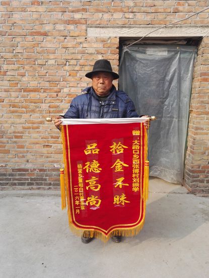 回到家,老人拉開拉鏈一看,提包里面內側還有一個拉鏈,拉開一看,里面有七千元現金,兩個存款折,一個醫保卡,還有身份證、買藥單據、手機等物品。劉振學拿起存折仔細看了看,以前每次只取一千多,這次一下子取了七千。他想:“這七千塊錢應該是急著看病的救命錢,失主一定非常著急,外財咱自己不能拿。”作為一名老黨員,多年的黨性教育使他感到必須盡快聯系到失主,不讓失主擔心。包里的身份證地址是楊營鎮董相白村,身份證上的姓名是董圣章,于是,劉振學拿起里面的手機,撥通了其子女的手機號,聯系到了失主。當天失主董圣章及其家人就趕到了劉振學老人的家里,劉振學拿著身份證對照,確認就是失主,經董圣章確認,包內物品、錢款無一丟失。從劉振學手中接過失而復得的提包后,83歲的董圣章激動地流下了眼淚,緊緊拉住劉振學的手說“想不到丟了這么多錢還能找回來,您真是好人,真是太感謝您啦!”。董圣章子女當場要給他一些錢表示酬謝,劉振學擺擺手拒絕了,他說:“作為一名共產黨員,我覺得這是我必須做的一件事情。”為表示感謝,董圣章老人將一面繡有“拾金不昧、品德高尚”的錦旗交到劉振學手中。