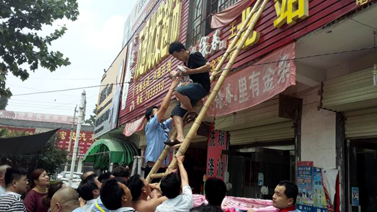 在消除重大安全隱患后,孫卓旗和前來救援的干警、群眾試圖通過狹窄的樓道進入二樓營救孩子時,發現濃煙順著樓梯蔓延,根本上不去,并且樓梯堆放了很多雜物,不利于救援。在樓下救援的過程中,二樓的孩子聞到了從樓梯擴散上來的濃煙,飯店老板王震的兒子,12歲的王延瑞在學校學習過自救措施,他立即關上通往二樓的門,避免濃煙彌漫到房間,并且跑到陽臺使勁用手掰斷了陽臺上的防盜窗欞,露出了一個大洞。這個動作提醒了孫卓旗,用梯子實施救援是唯一的辦法。他一面穩住二樓的孩子不要亂,一面借來梯子,想通過梯子把孩子接下來。但是,由于梯子太短,與二樓的窗戶相差1米多,人根本上不去。看到這種情況,孫卓旗果斷的將梯子抬放到自己的肩膀上,為了避免施救人員和孩子從上面掉下來摔傷,他又跑到加油站拿來兩床棉被,身邊的群眾和民警一邊扶著梯子,一邊扯開棉被,經過警民的同心協力,4名兒童被成功救出。救出孩子后,孫卓旗又和干警隊繞到廚房后面,用消防栓和群眾剛接好的水龍頭對操作間進行滅火和冷卻處理,把安全隱患徹底消除。
