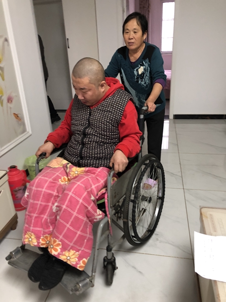 “以前冬天沒暖氣,兩個孩子不能活動怕冷,我給他們每個人都做了30多條棉褲,每天棉褲都像棉被那么厚。他們大小便都不能自理,經常把棉褲、被褥弄臟,我每天給他們換幾條、經常拆洗,但就是這樣,兩個孩子的腿上凍得都是黑色的泡。”提起這些,周素真難掩心酸。“前年我們回遷到花園社區了,冬天有暖氣,孩子也沒那么受罪了!闭f到這里,她又笑了起來!昂⒆娱L大了,我歲數也越來越大,已經抱不動他們了,以后我們歲數大了,可能照顧他們就更難了!敝芩卣嬲f。