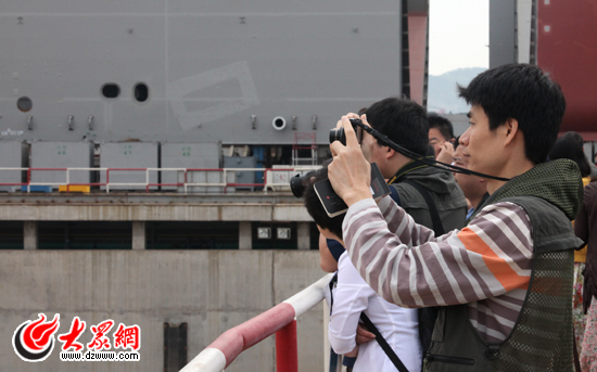 在北船重工廠區內,采訪團記者頻頻舉起手中的相機。(盛堃 攝影)