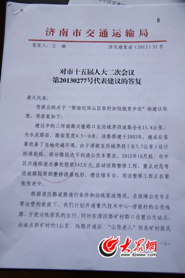 今天下午,大眾網(wǎng)記者見(jiàn)到了濟(jì)南市人大代表梁凡。他告訴記者,最近幾天,濟(jì)南市交通運(yùn)輸局、市中區(qū)交通局、市中區(qū)農(nóng)業(yè)局的有關(guān)負(fù)責(zé)人先后找到他,對(duì)他提交的“幫助近郊山區(qū)農(nóng)村加快脫貧步伐”的建議進(jìn)行了面復(fù)。